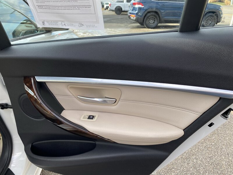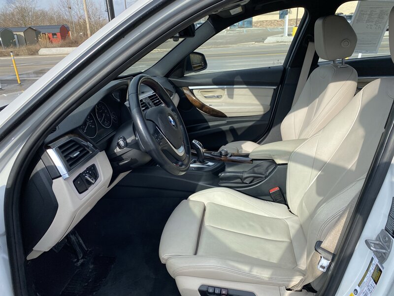 2016 BMW 328i xDrive in Alpine White with Saddle Brown premium leather, powered by a 2.0L turbocharged I4 producing 240 hp and 255 ft-lb of torque; equipped with BMW xDrive all-wheel drive and an 8-speed automatic transmission. Factory features include BMW iDrive infotainment with controller, Bluetooth and USB audio connectivity, dual-zone automatic climate control, power-adjustable front seats with lumbar support, premium leather seating surfaces, power windows/locks/mirrors, and push-button start. Standard safety and driving aids include ABS, multiple airbags, and stability/traction control; the car rides on alloy wheels and delivers an EPA-rated 22 MPG city / 34 MPG highway. Vehicle is in excellent overall condition with a clean CARFAX.