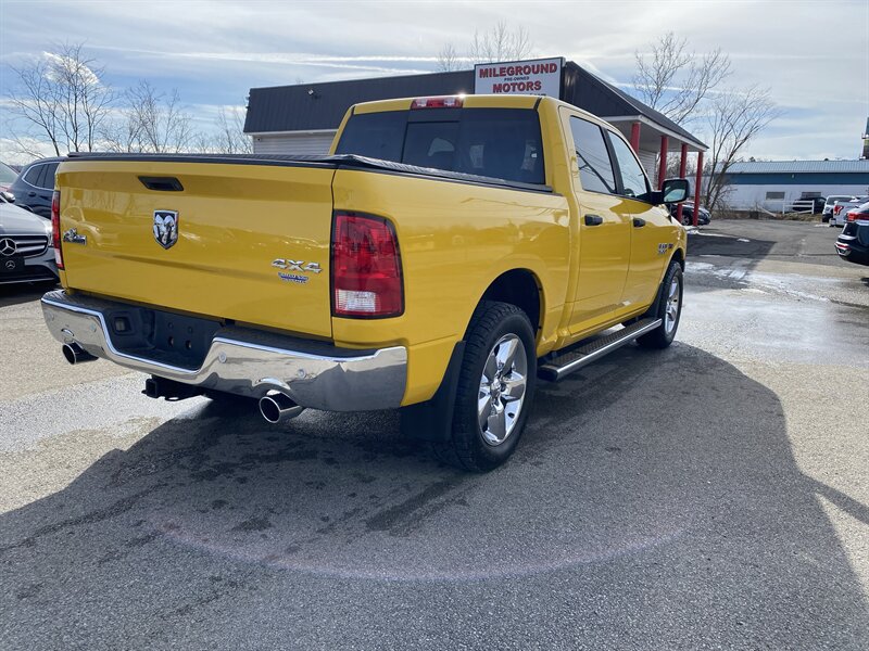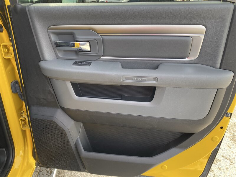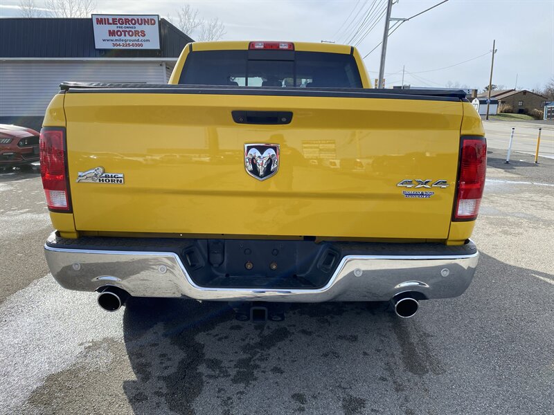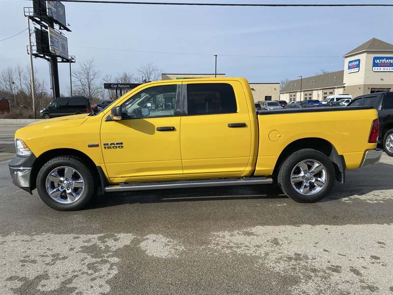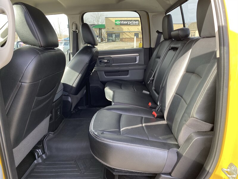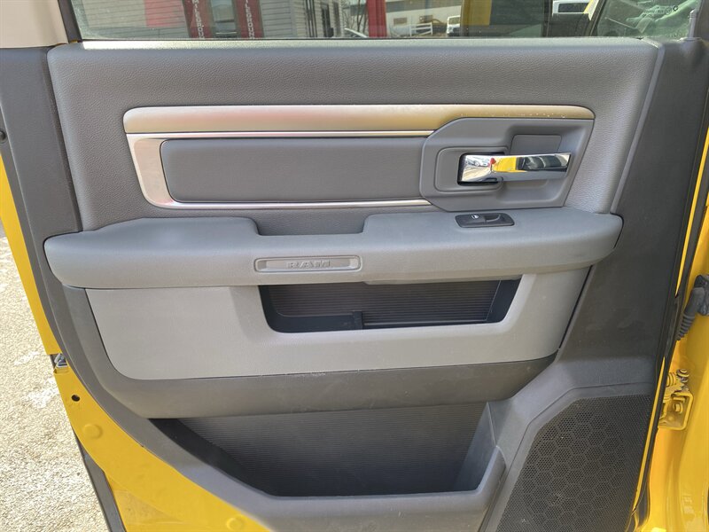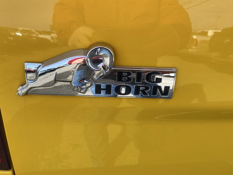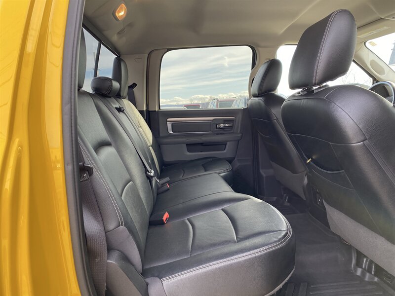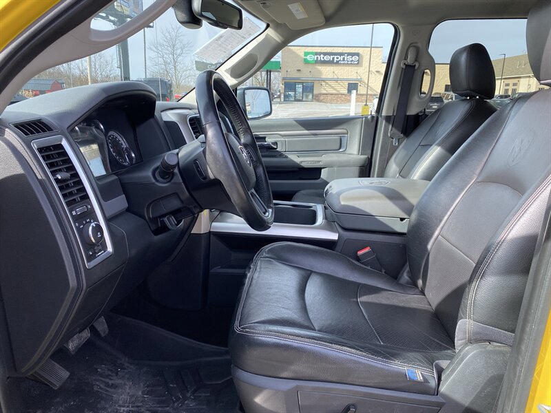 2016 RAM 1500 SLT powered by a HEMI 5.7L V8 (395 hp, 410 lb-ft); EPA-rated 15 MPG city / 21 MPG highway. Factory equipment includes power windows, locks and mirrors, remote keyless entry, cruise control and steering-wheel audio controls, Uconnect infotainment with Bluetooth and USB connectivity, air conditioning, alloy wheels, premium Black/Diesel Gray leather seating, and standard safety systems such as ABS, traction and stability control with multiple airbags. Finished in Detonator Yellow Clear Coat, this truck is in excellent overall condition and has a clean CARFAX.