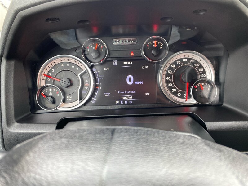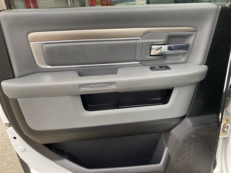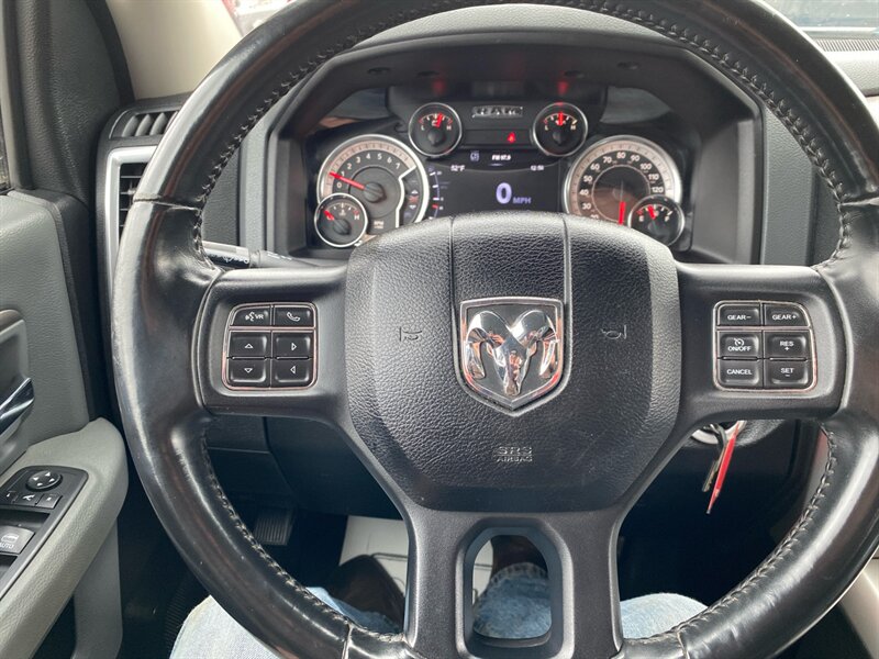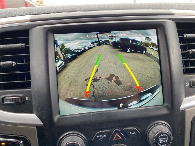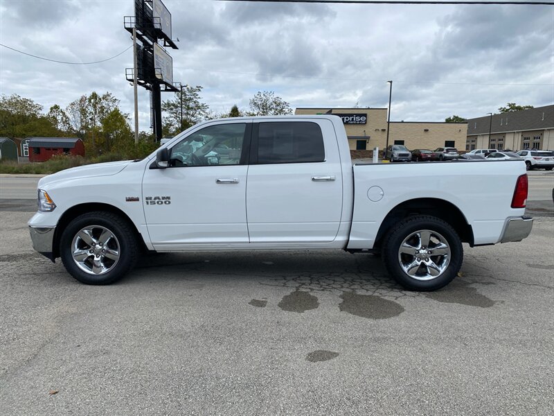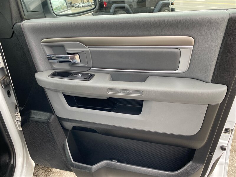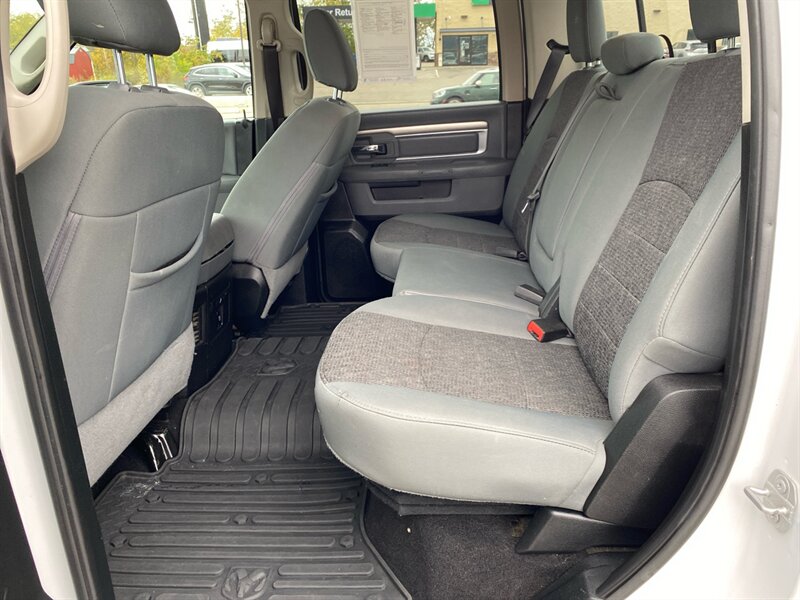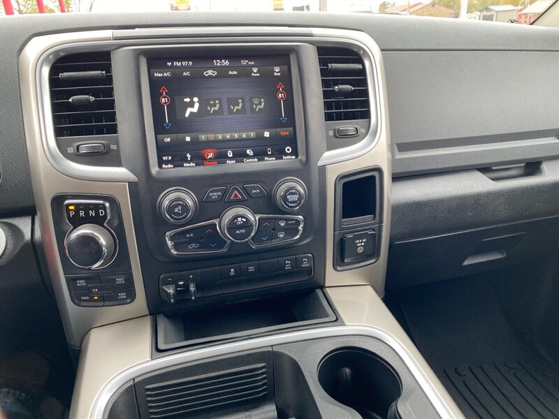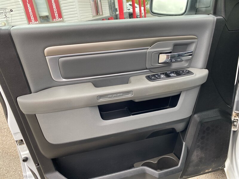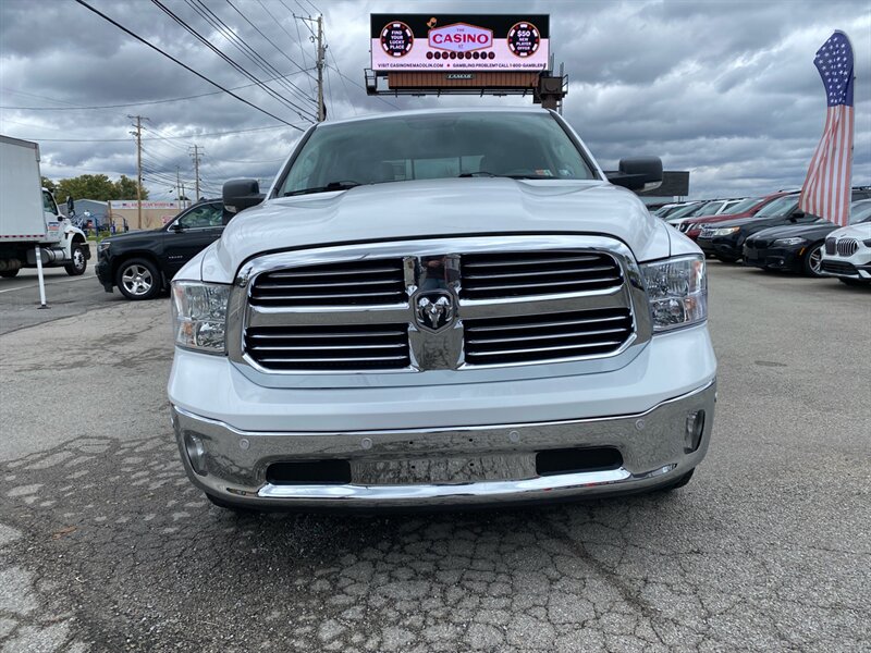 Introducing the 2018 RAM 1500 Big Horn, a robust pickup designed for both work and play. Powered by a HEMI 5.7L V8 engine, it delivers an impressive 395 horsepower and 410 lb-ft of torque, ensuring you have the strength needed for any task. The exterior showcases a striking white finish, while the interior features comfortable black upholstery, providing a stylish contrast. This model is equipped with a range of factory default features, including a 8.4-inch touchscreen infotainment system with Uconnect, Bluetooth connectivity, a rearview camera, and dual-zone automatic climate control. The RAM 1500 Big Horn also offers convenient storage solutions, such as in-floor storage bins and a spacious crew cab. With fuel efficiency rated at 15 MPG in the city and 21 MPG on the highway, it balances power with practicality. This vehicle is in excellent overall condition, making it a reliable choice for any driver.