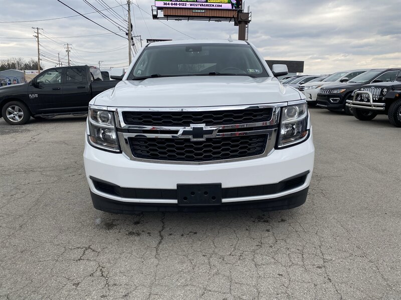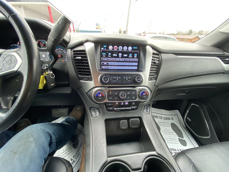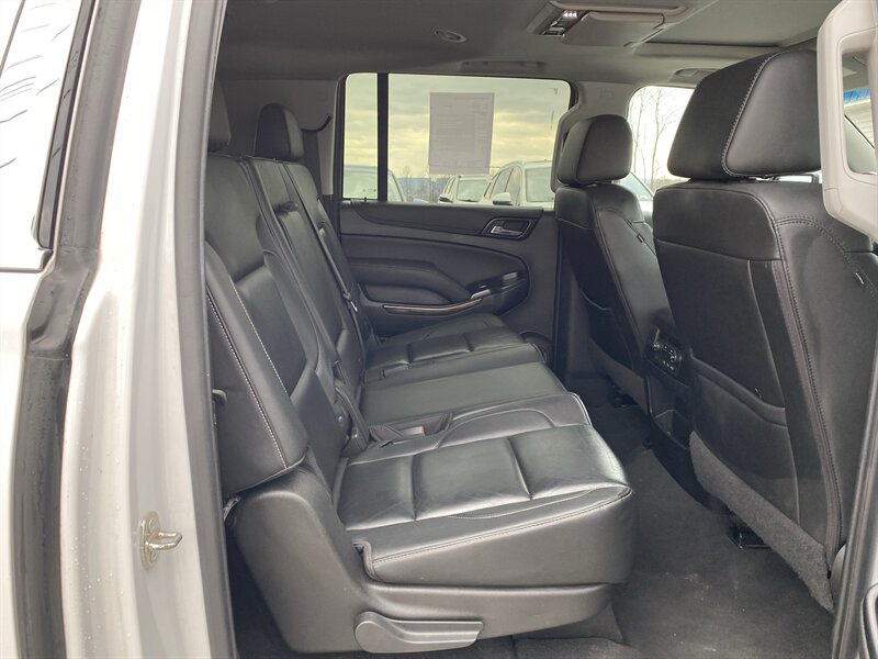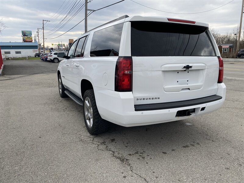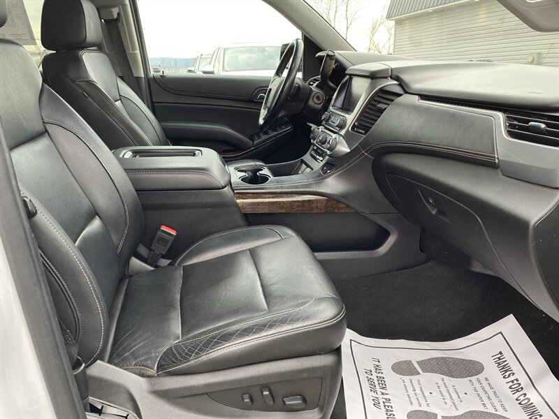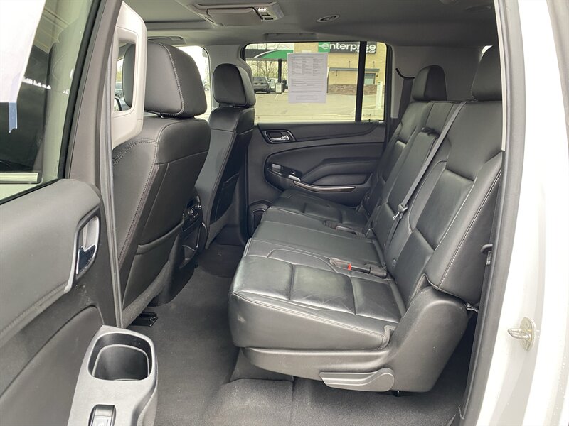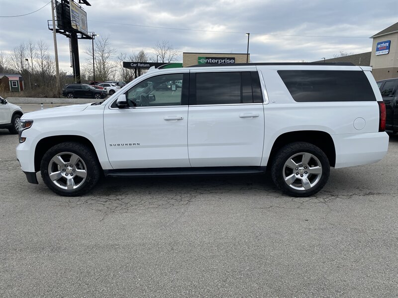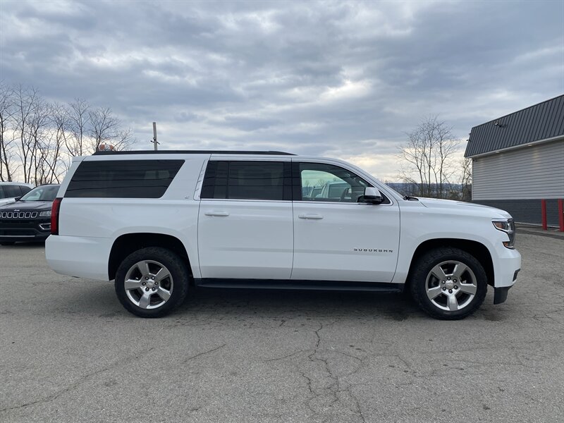 2019 Chevrolet Suburban LT in Iridescent Pearl Tricoat with Jet Black premium leather interior. Powered by an EcoTec3 5.3L V8 producing 355 hp and 383 lb-ft of torque, with EPA ratings of 14 MPG city and 21 MPG highway. Factory-standard equipment includes an 8-inch Chevrolet Infotainment touchscreen with Apple CarPlay/Android Auto and Bluetooth, AM/FM/SiriusXM-ready audio, tri-zone automatic climate control, power windows and door locks with remote keyless entry, cruise control and steering-wheel-mounted audio/phone controls, power-adjustable front seats with leather-appointed seating, alloy wheels and roof rails. Safety and convenience features include a rearview camera, StabiliTrak electronic stability control, traction control, ABS, multiple airbags, and OnStar with available 4G LTE Wi-Fi; towing capability and trailer stability assist are factory-supported. Vehicle is in excellent overall condition, has a clean CARFAX and one previous owner.