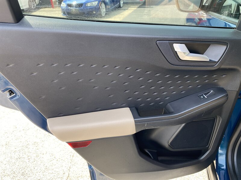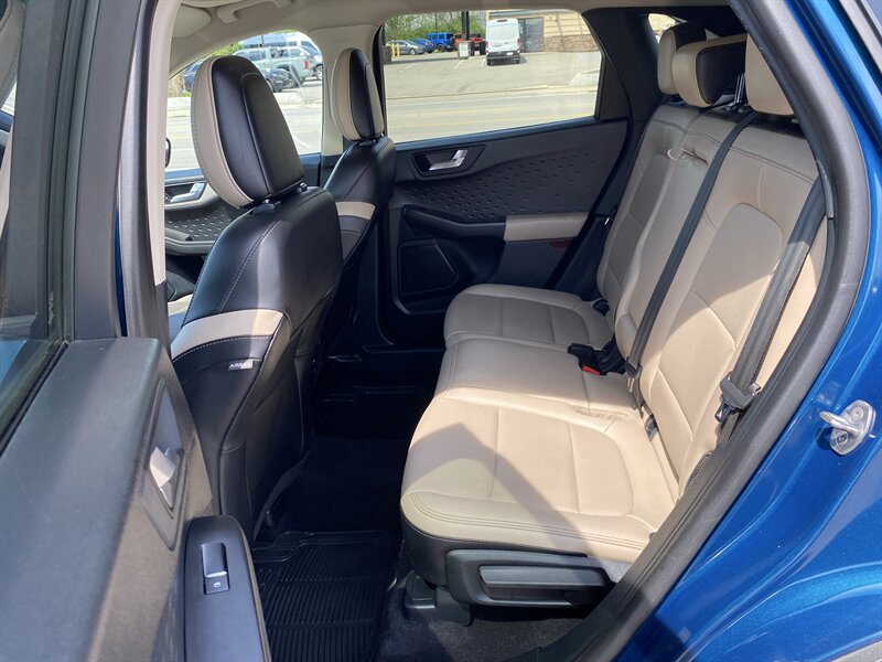 2020 Ford Escape SEL finished in Dark Persian Green with Sandstone premium leather seating, powered by the EcoBoost 2.0L Turbo I4 (250 hp, 280 lb-ft) and rated at 23 MPG city / 31 MPG highway. Factory equipment includes an 8-inch SYNC 3 touchscreen with Apple CarPlay and Android Auto, Bluetooth and USB connectivity, dual-zone automatic climate control, power-adjustable driver’s seat, remote keyless entry with push-button start, alloy wheels and LED daytime running lights. Standard driver-assist and safety systems include a rearview camera and Ford Co-Pilot360 features such as Pre-Collision Assist with Automatic Emergency Braking, Lane-Keeping System and automatic high beams, with blind-spot monitoring and rear cross-traffic alert. Vehicle is in excellent overall condition and has a clean CARFAX report.