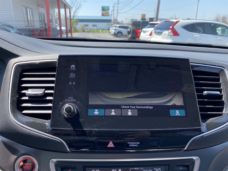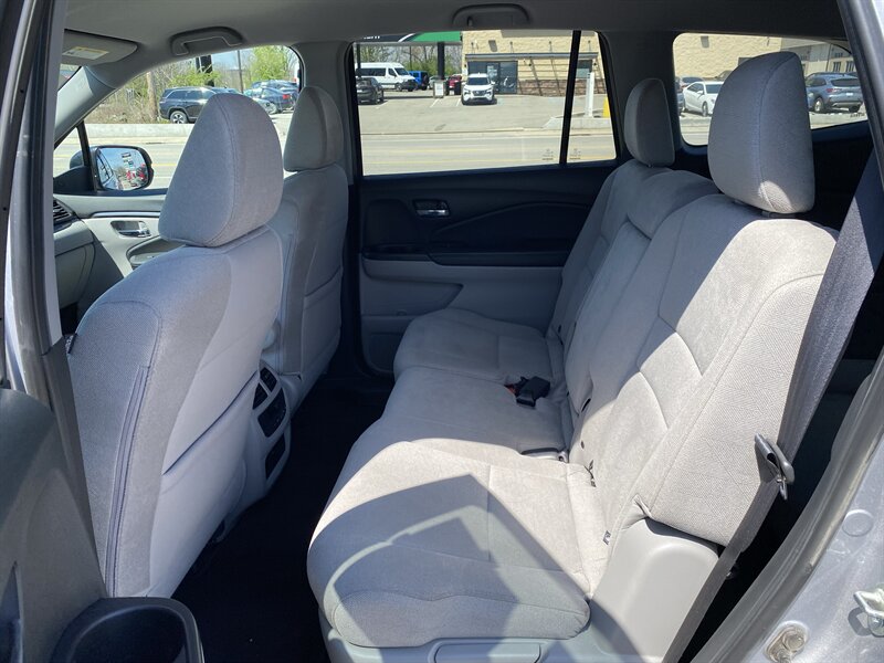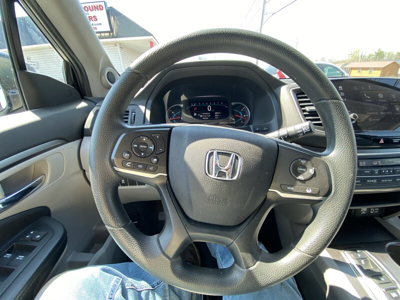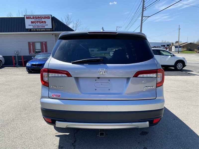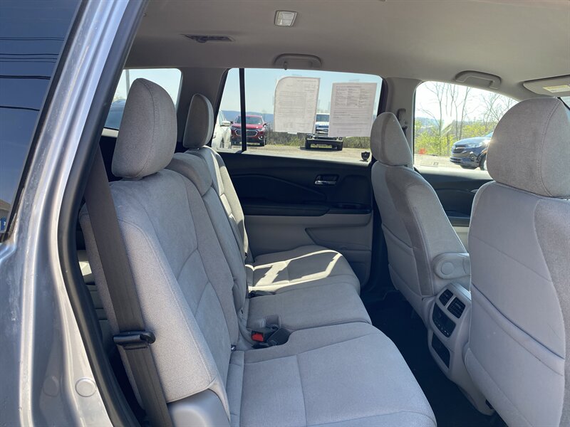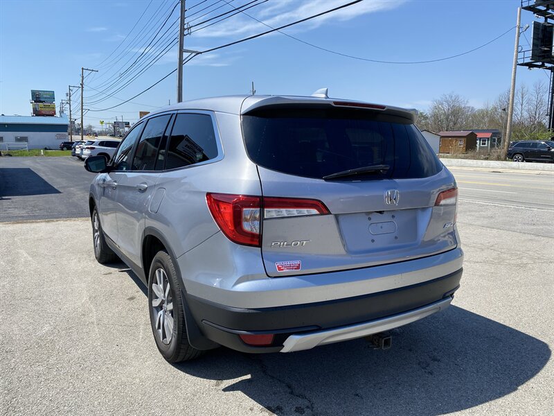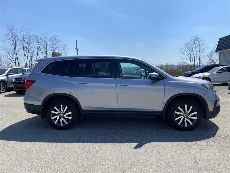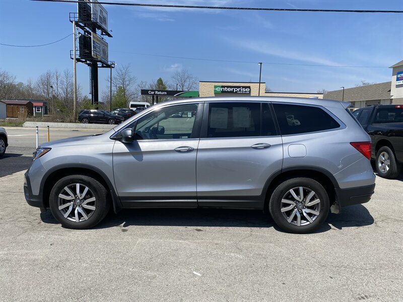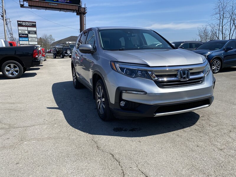 2021 Honda Pilot EX powered by a 3.5L V6 (280 hp, 262 lb-ft) paired with a smooth automatic transmission. Factory equipment includes the Honda Sensing suite (Adaptive Cruise Control, Collision Mitigation Braking, Lane Keeping Assist, Road Departure Mitigation), an 8-inch Display Audio touchscreen with Apple CarPlay and Android Auto, Bluetooth and multiple USB ports, tri-zone automatic climate control, keyless entry with push-button start and remote engine start, multi-angle rearview camera, Blind Spot Information System with Cross Traffic Monitor, roof rails, 18-inch alloy wheels, heated front seats, and seating for up to eight in durable gray premium cloth. Exterior is Lunar Silver Metallic with a Gray premium cloth interior. EPA fuel economy is 19 MPG city / 26 MPG highway. Vehicle is in excellent overall condition, has a clean CARFAX, and one previous owner.